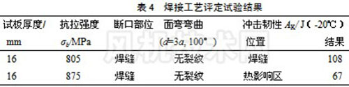 (2) 這類高強度合金鋼材料在焊接時,可選用強度等級低于母材而沖擊韌性高于母材的堿性焊條如J707進行電弧焊打底,再用JQ·YJ501-1藥芯焊絲CO2保護焊,進行多層多道焊覆蓋,其焊縫的力學性能能滿足設計要求。