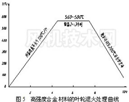 而WELDOX及HQ785材料可采用退火 去應力處理,其工藝見圖5。葉輪出爐空冷后,強度幾乎不降,有時還略有上升,原因是工件在退火前存在于組織中的部分不穩(wěn)定相如 淬火屈氏體等在退火過程中得以轉化為穩(wěn)定相。